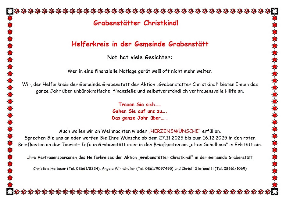 Wir, der Helferkreis der Gemeinde Grabenstätt der Aktion „Grabenstätter Christkindl“ bieten Ihnen das ganze Jahr über unbürokratische, finanzielle und selbstverständlich vertrauensvolle Hilfe an.