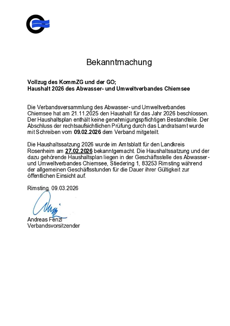 Die Haushaltssatzung 2026 wurde im Amtsblatt für den Landkreis Rosenheim am 27.02.2026 bekanntgemacht. Die Haushaltssatzung und der dazu gehörende Haushaltsplan liegen in der Geschäftsstelle des Abwasser- und Umweltverbandes Chiemsee, Stiedering 1, 83253 Rimsting während der allgemeinen Geschäftsstunden für die Dauer ihrer Gültigkeit zur öffentlichen Einsicht auf.