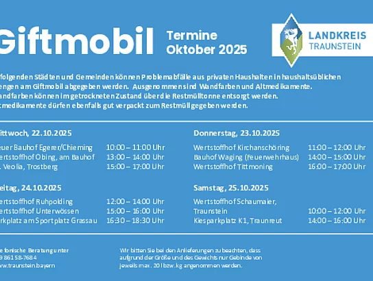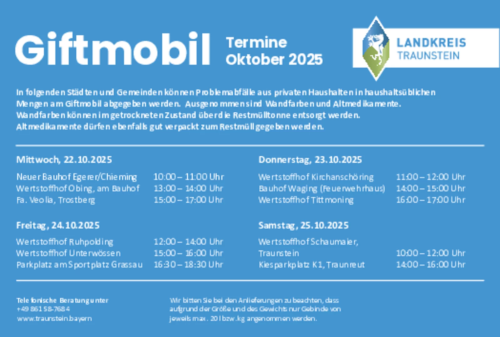 Autobatterien | Rücknahme bei Auto- oder Schrotthändler Rückgabepflicht bei Neukauf (sonst 7,-€ Pfand) - Fa. Chiemgau-Metall, Obing; 08624/8783-0 - Fa. Remondis Chiemgau, Chieming, Tel. 08664/98850 - Fa. Schaumaier, Traunstein; Tel 0861/166860 |