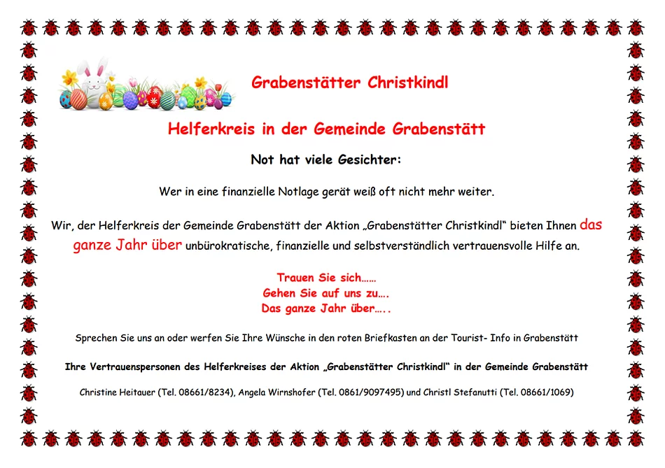 Wir, der Helferkreis der Gemeinde Grabenstätt der Aktion „Grabenstätter Christkindl“ bieten Ihnen das ganze Jahr über unbürokratische, finanzielle und selbstverständlich vertrauensvolle Hilfe an.