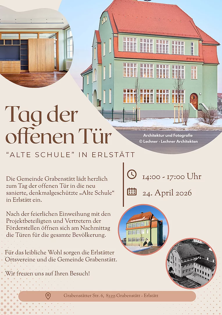 Der Tag der offenen Tür der neu sanierten denkmalgeschützen "Alten" Schule" in Erlstätt findet am 24.04.2026 von 14:00 - 17:00 Uhr statt.